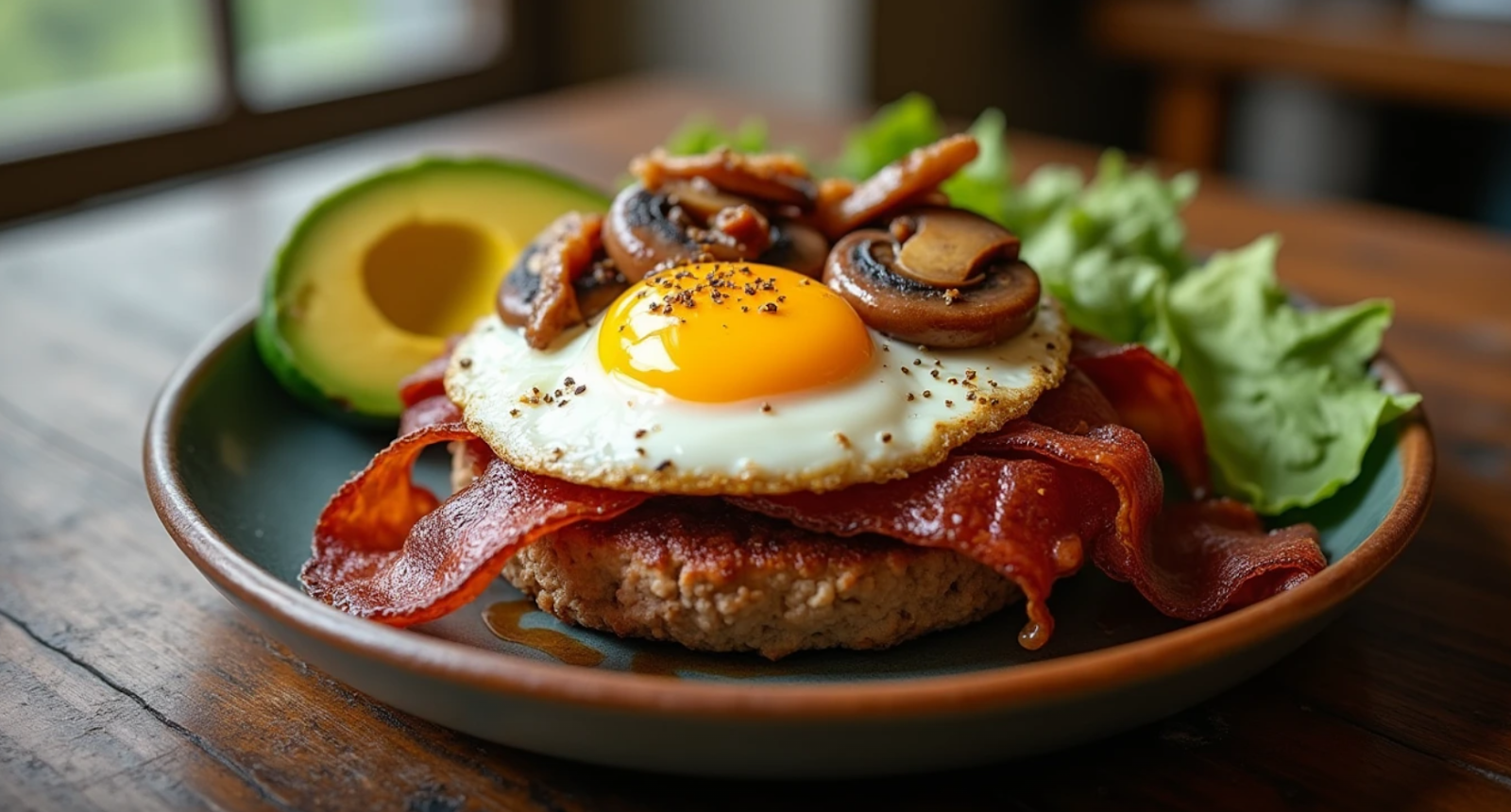 - Assemble: Stack the burger, then add bacon and an egg. Top with mushrooms and onions. Serve avocado slices on the side.